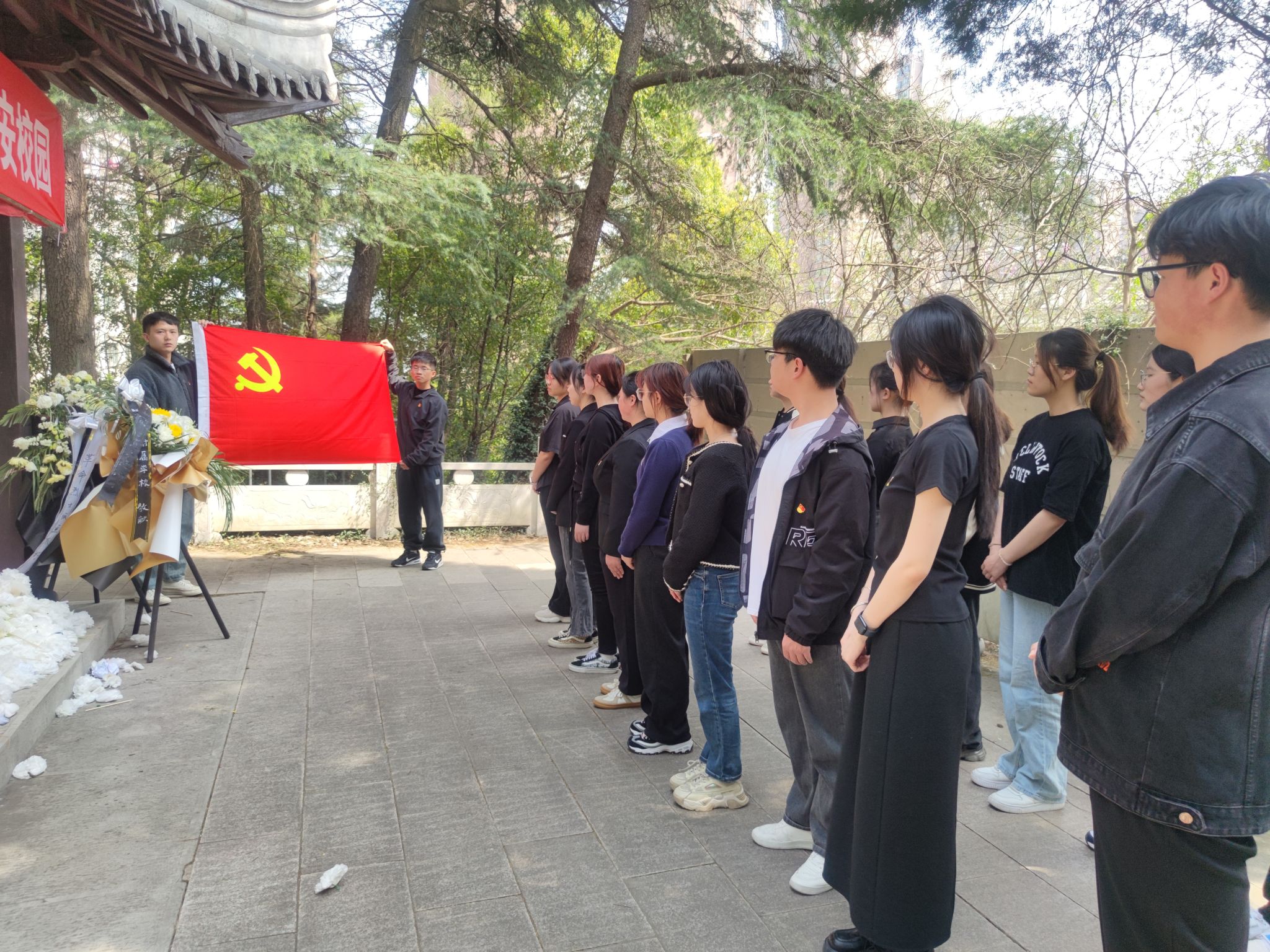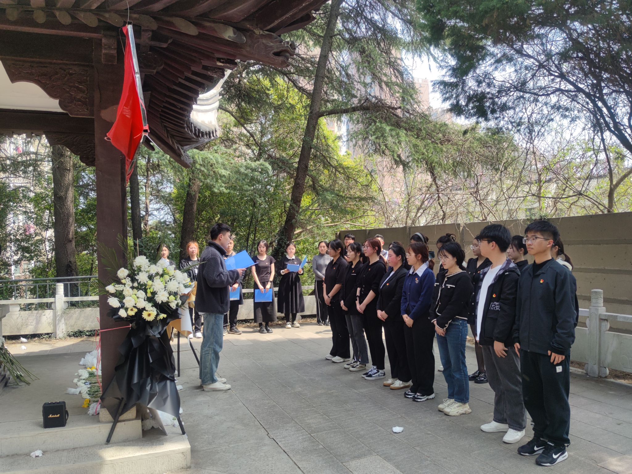 活动中,教师党员代表吴启睿以历史为脉络,讲述了王龙烈士临危不惧、宁死不屈的英勇事迹,激励广大青年继承和发扬革命精神和光荣传统,使红色基因薪火相传。在场师生向王龙烈士献上了小白花并默哀三分钟,深切缅怀这位为国牺牲的革命志士。