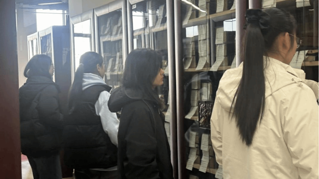 在身临其境的探秘过程中,蒋雨老师带领同学们近距离观看古籍,聆听古籍无声诉说的历史,体会其中的文化传承脉络。学生们神情肃穆,眉眼间都充满了对历史的敬畏和对文化的尊重,在无形中增强同学们的文化自信,中华传统文化的绵延发展也得到了进一步推动。