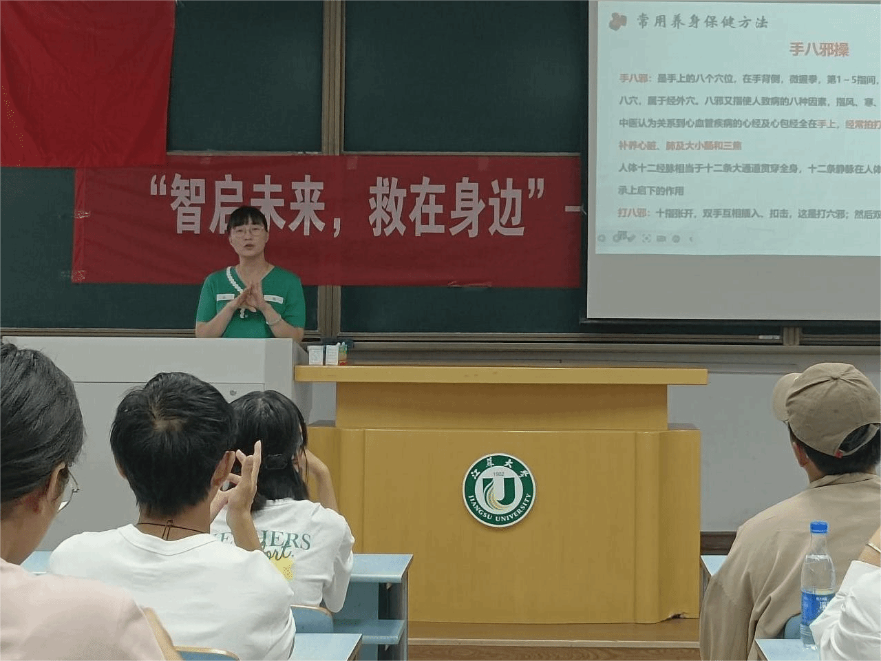 活动分为急救知识培训和中医养生知识两部分内容。许磊围绕急救知识,详细讲解了海姆立克急救法和心肺复苏具体操作步骤,并进行现场演示。阮园则聚焦中医养生知识,分享了中医养生小妙招。活动过程中,两位医生结合ppt讲解、现场演示以及观众互动参与等形式,活动现场气氛活跃,同学们的参与度与积极性高。